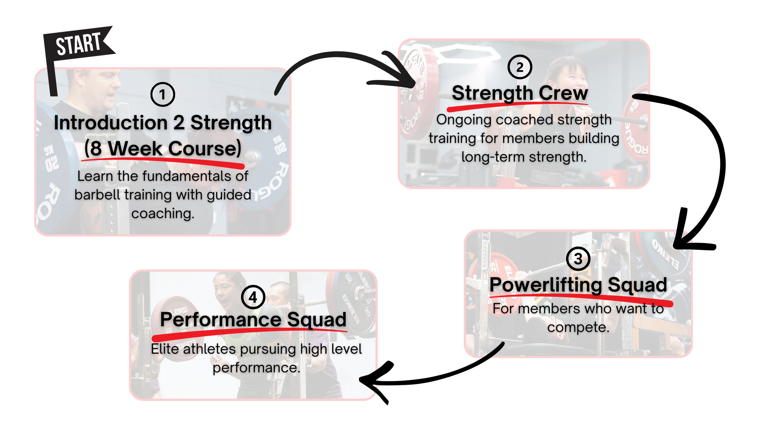 Our coaching system guides members from learning the fundamentals of strength training through to long-term development and competition.